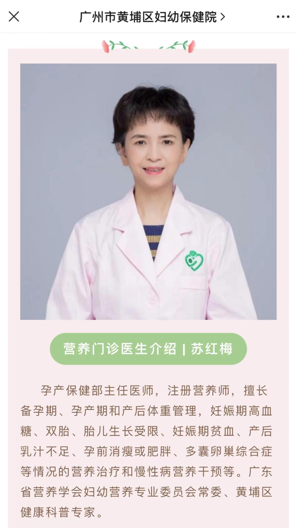 大家好,我是苏红梅。1993年,我于中山医科大学妇幼卫生系毕业,在广州市妇婴医院工作14年;然后工作调动到了萝岗区(后合并至黄埔区)、黄埔区;目前在广州市黄埔区妇幼保健院工作,担任妇女保健主任医师,主要工作是孕产妇保健和行业管理,其次为营养工作——自己一周有1、2天时间坐营养门诊、在孕妇学校讲授营养课程。从业起初到现在,我从事妇幼保健工作已经有30多年了。