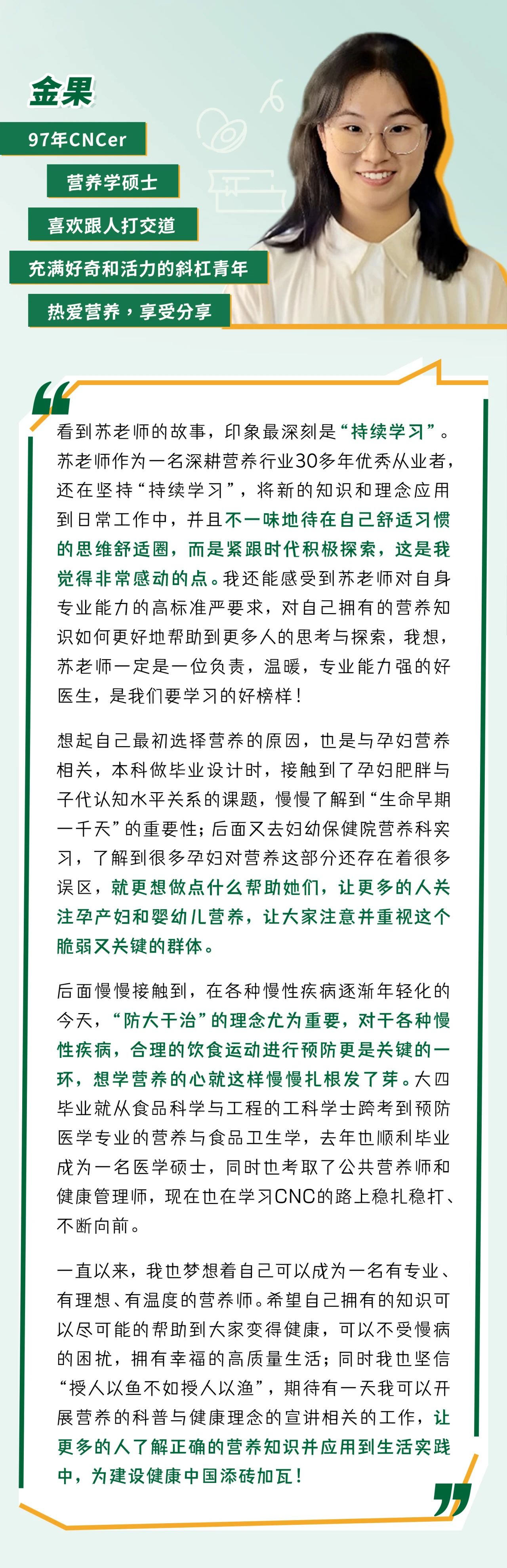 前辈的真诚分享很难不令人鼓舞,苏老师的洞见与经验是非常值得尊敬与钦佩的。正是有像苏老师这一辈营养师的坚守与坚持,为后来新一代营养师点明了前行的方向,这种倾囊分享的精神想必也会对我们每一个人产生积极影响。