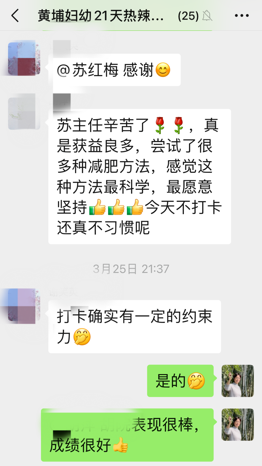 而后我就开了自己的第一期线上减脂营,整体效果是比较满意的。由于是第一次做,我就在同事当中招募会员;大家报名很踊跃,自己做的海报刚在工会群里发送,一小时内就有20多个同事报名。在20多人的线上减脂营中,我根据在CNC学到的东西,在群里分享知识、鼓励打卡,大家的打卡热情都很高;接近结营时,大家的减脂效果也实打实出来了,21天营员们累计减重22公斤,减脂42个百分点,体脂率明显下降。结营后我也在继续跟踪同事的数据,发现不少同事仍在持续沿用减脂营里的习惯来坚持减脂,同事们给我的反馈也在于认为这种方式很好,自己的健康生活方式被培养起来了。