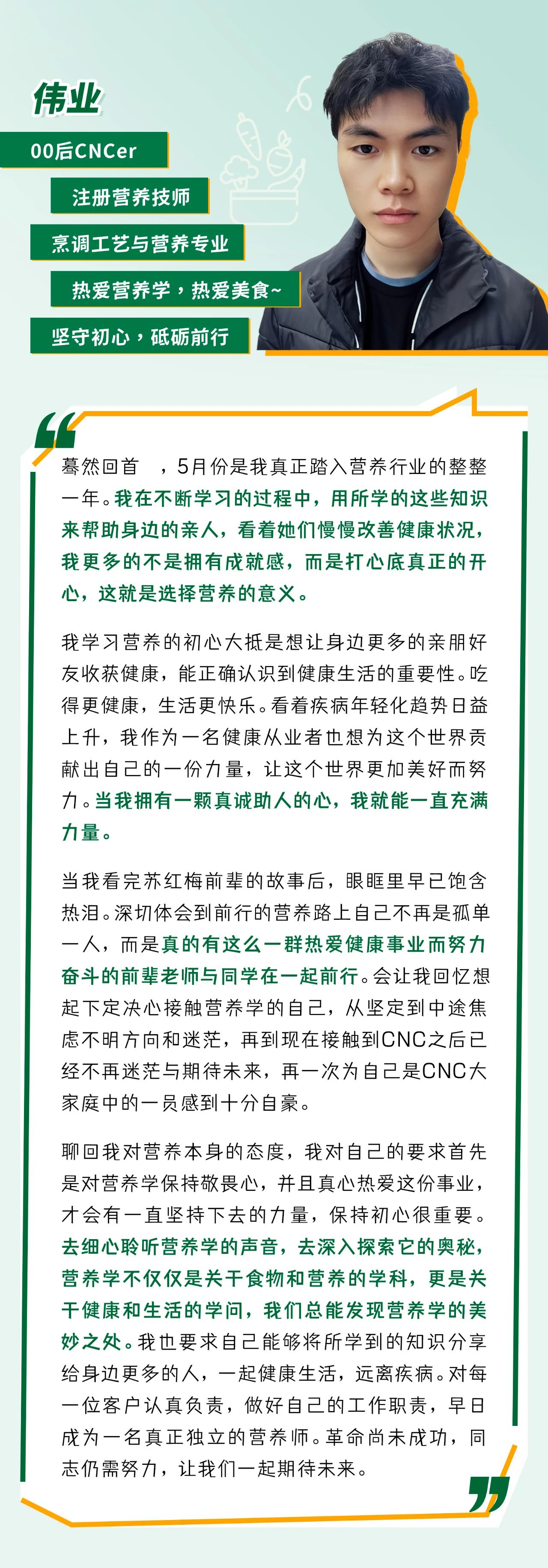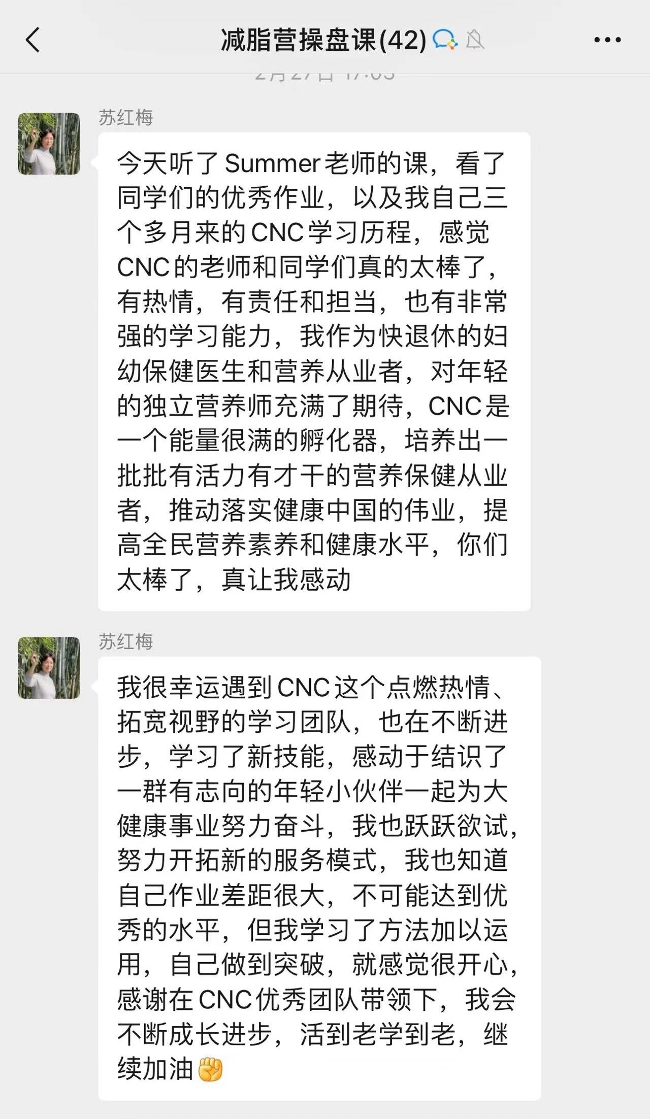 几个月的学习,让我收获很大。即便是多年从业者,我依然觉得CNC课程给我带来了很多新的学习补充。学习实践应用课,特别是学习减脂营操盘实战课后,觉得自己的多维能力有了不小提升。我现在还是没有考证的在读CNCer,还会一直持续学习下去。CNC让我接触到了一片新天地,原来有这么多热爱健康、有使命感的年轻人,投身到营养学习中,这是非常好的情况,说明大众的健康意识不断提高,健康管理愈发可以真切地从家庭做起。